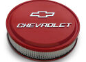 The Red Slant-Edge Air Cleaner is the perfect way to complete your dress-up look in style. The large raised and milled Bowtie and Chevrolet Emblems on this premium 14" air cleaner kit will garner attention whenever you pop the hood!
