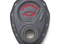 This Shark Gray timing chain cover has distinctive recessed Bowtie and CHEVROLET Emblems with inlaid red paint. For long-term corrosion resistance the cover is electrostatically painted and baked with a durable gray epoxy.